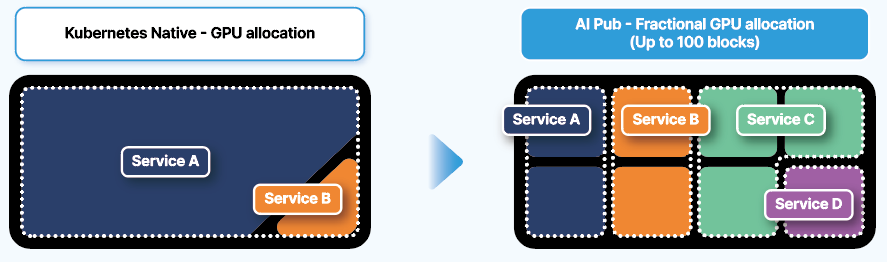 - Fractional GPU: GPU 자원을 10%, 20% 단위로 분할해 병렬 작업 가능