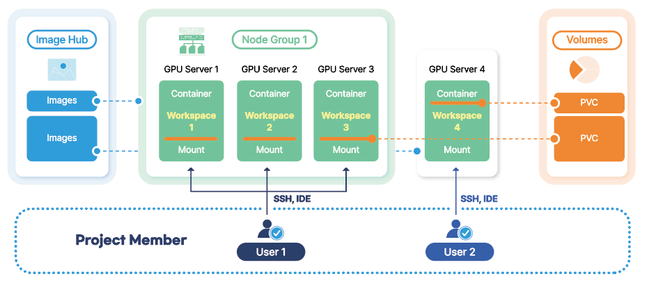 AI Pub은 물리적인 GPU를 논리적으로 분할하여 여러 작업자가 동시에 사용할 수 있도록 지원합니다.
